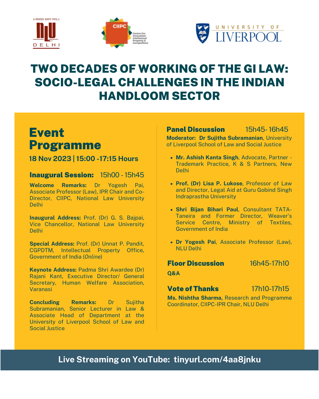 The symposium on “Two Decades of Working of the GI Law: Socio-Legal Challenges in the Indian Handloom Sector” was organized by the Centre for Innovation, Intellectual Property and Competition (CIIPC) and DPIIT IPR Chair, National Law University, Delhi in collaboration with the University of Liverpool on 18 Nov 2023. The event was held at National Law University Delhi and was also live streamed on YouTube.